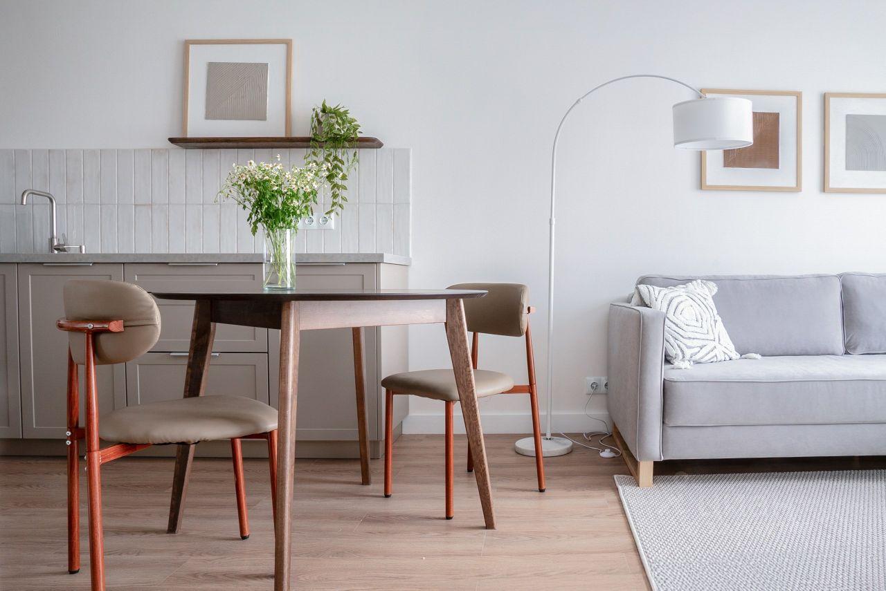 Идеальная для 1-2 человек планировка (евродвушка): спальня с двухспальной кроватью и качественным матрасом для сна и кухня-гостинная для отдыха и удаленной работы.